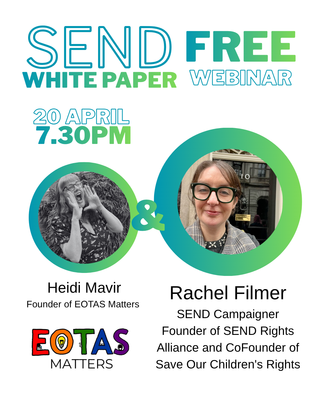On 20 April, we invite you to join Heidi Mavir, Founder of EOTAS Matters and special guest, Rachel Filmer, Founder of SEND Rights Allowance and CoFounder of Save Our Children's Rights for a deep dive into the SEND White Paper in FREE online Webinar.